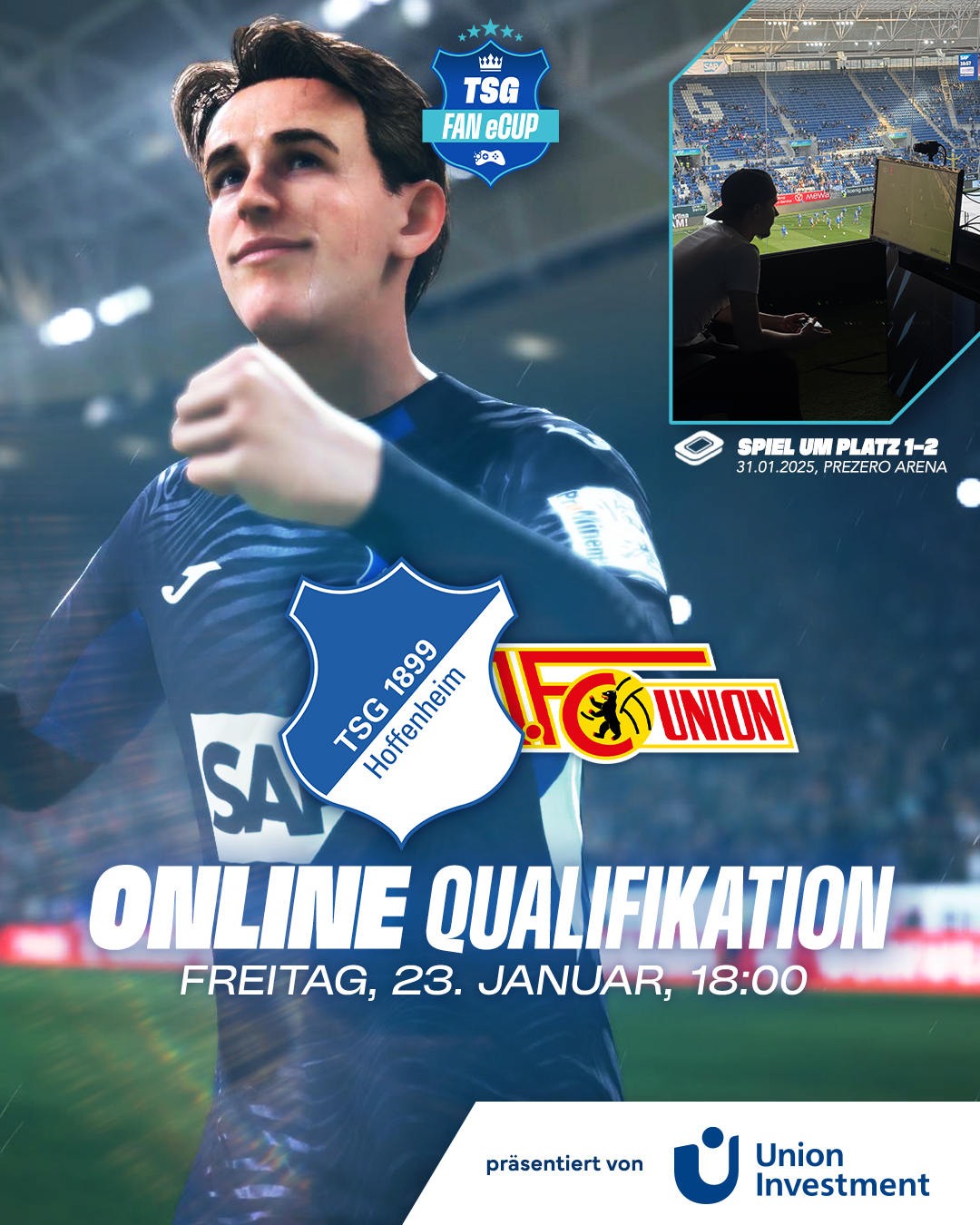 Der TSG-Fan eCup powered by Union Investment umfasst mehrere Turniere und existiert in dieser Form seit 2019. Die Besonderheit ist, dass es sich pro Turnier um einen Mix aus Online- und Offline-Event handelt. Die Qualifikation für das 1vs1 Offline-Finale in der PreZero Arena findet freitags – eine Woche vor einem Heimspieltag – als Online-Turnier statt. Das Finale wird dann direkt vor dem Heimspiel der TSG Hoffenheim im Gaming-Studio mit Blick auf das Spielfeld ausgetragen. Als Spieler/in kann man zwischen der TSG Hoffenheim und dem kommenden Gegnerteam wählen. Gespielt wird im 95er Modus wahlweise auf PlayStation, Xbox und PC im 1vs1 K.O.-Modus.